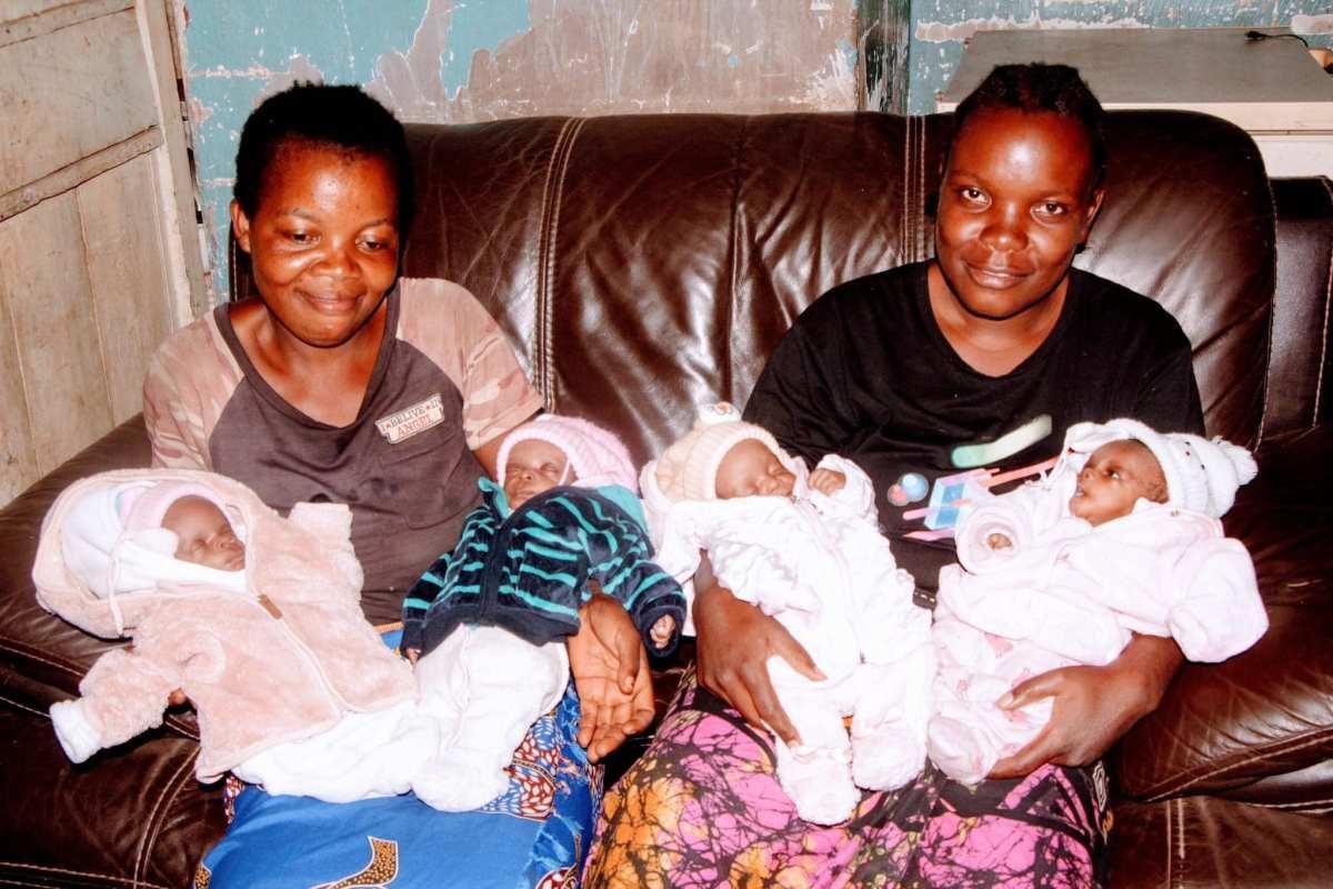 Africa-Press – Zambia. A 29-year-old single mother of Mushili Kansengu Thabita Mwamba (right, black) pose with her month-old quadruplets assisted by a Cousin Mervis Kalenga.