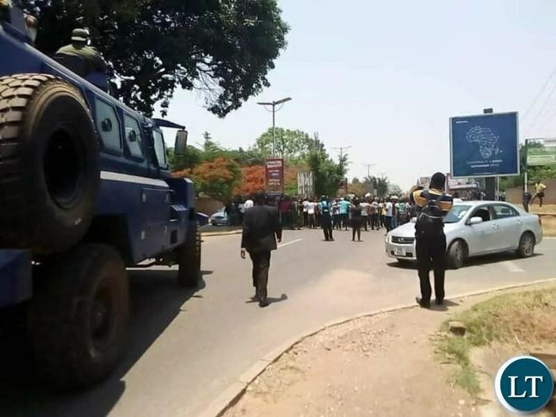 Africa-Press – Zambia. Hundreds of University of Zambia (UNZA) students are protesting over the go-slow by lecturers who are demanding paying of arrears and gratuities. The students that had started matching from UNZA to State House were later sent back on Addis Ababa road by Police officers.