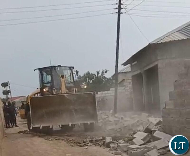 Africa-Press – Zambia. Yesterday, Kamwala Ward Councillor Mainda Simataa led a team of Lusaka City Council – LCC Police escorted by armed Zambia Police in a demolition exercise of two (2) illegal boundary walls on properties that had encroached on a road reserve and restricted road access for the community.