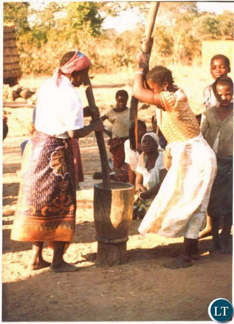 Kukaya is where during the cold nights in June one can sit with relatives around a fire late into the night sharing folktales and chatting about yesteryear, while eating sweet potatoes or mbohori which had earlier been buried deep in the ambers of the glowing fire for cooking. Kukaya is the only place where the grave yard has all your relatives from bygone days buried in one place. Kukaya has a special place in our hearts that we yearn in our souls to visit and dream about every day. Visit the Mwizenge Sustainable Model Village outside Chongwe to see and experience Kukaya. Two Women Pounding Kukaya