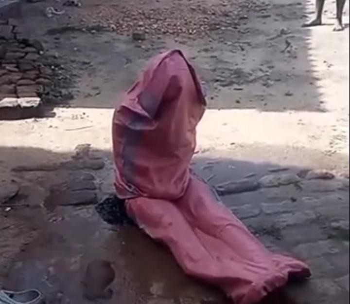 In the video, the father is seen holding a log while confronting his daughter, whose body is wrapped in sacks, leaving neither her upper body nor legs visible.