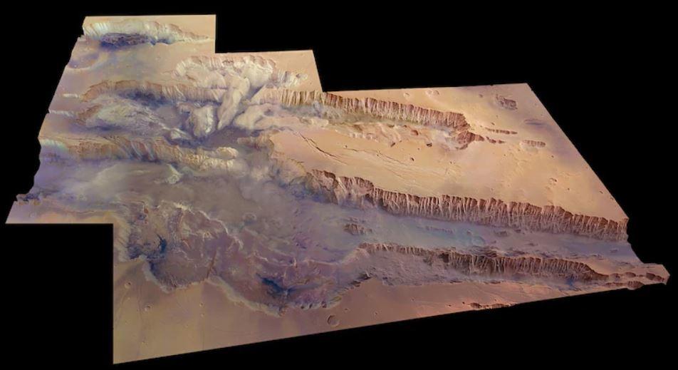 The discovery was made by the Fine Resolution Epithermal Neutron Detector (FREND) telescope onboard the spacecraft. It revealed an area with an unusually large amount of hydrogen in the colossal Valles Marineris canyon system.