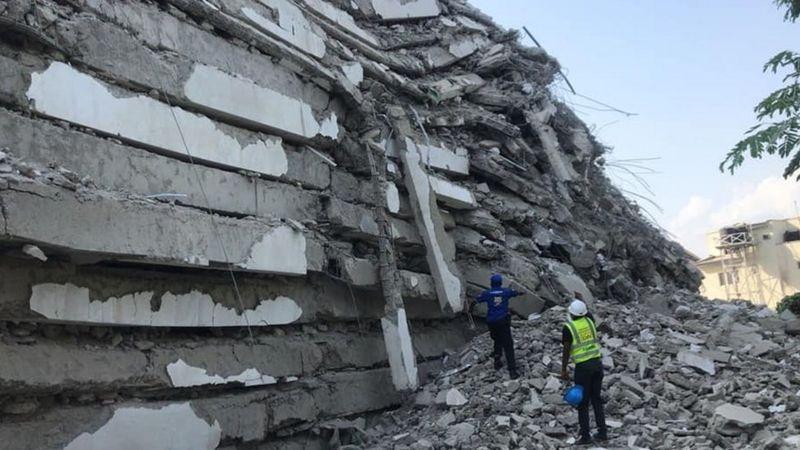 The building came down at around 14:45 local time (13:45 GMT) in the upmarket district of Ikoyi.
